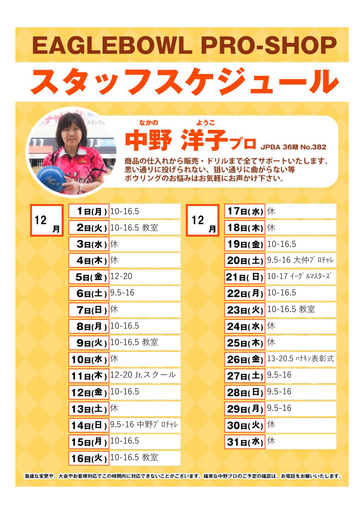 2025年12月 中野プロスケジュール
