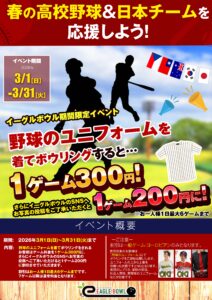 イーグルボウルでは春の高校野球×日本チームの応援イベントを開催いたします⚾