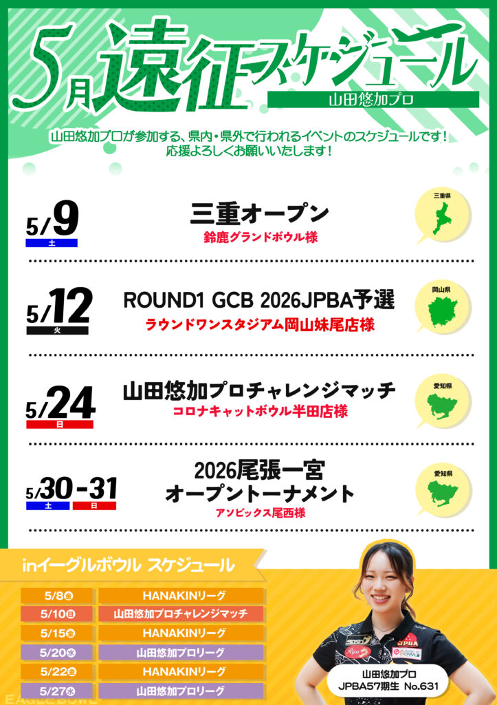 山田悠加プロの5月のスケジュールを共有させていただきます。